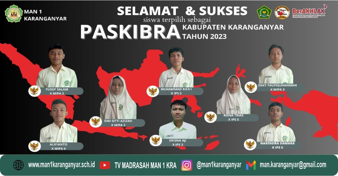 Siswa siswi yang lolos yaitu Dwi Sitti Azizah Hasan (X MIPA 2), Risna Trias Paramita (X IPS 5), Yusuf Salam Mikhailov (X MIPA 2), Zaky Taufiqurrohman (X MIPA 3), Muhammad Rifa’i (X IPS 5), Narendra Damar Wibowo (X IPS 5), Alifianto Ardiansyah (X MIPA 6), Krisna Aji Pangestu (X IPS 3). Seleksi PASKIBRAKA tingkat Kabupaten Karanganyar dari 33 SMA/SMK/MA, Negeri maupun swasta diseluruh Kabupaten Karanganyar ini. Dari sejumlah 356 siswa diambil dan terseleksi total 76 peserta, Yaitu terdiri dari 34 kelompok putri dan 42 kelompok putra.(25/05)