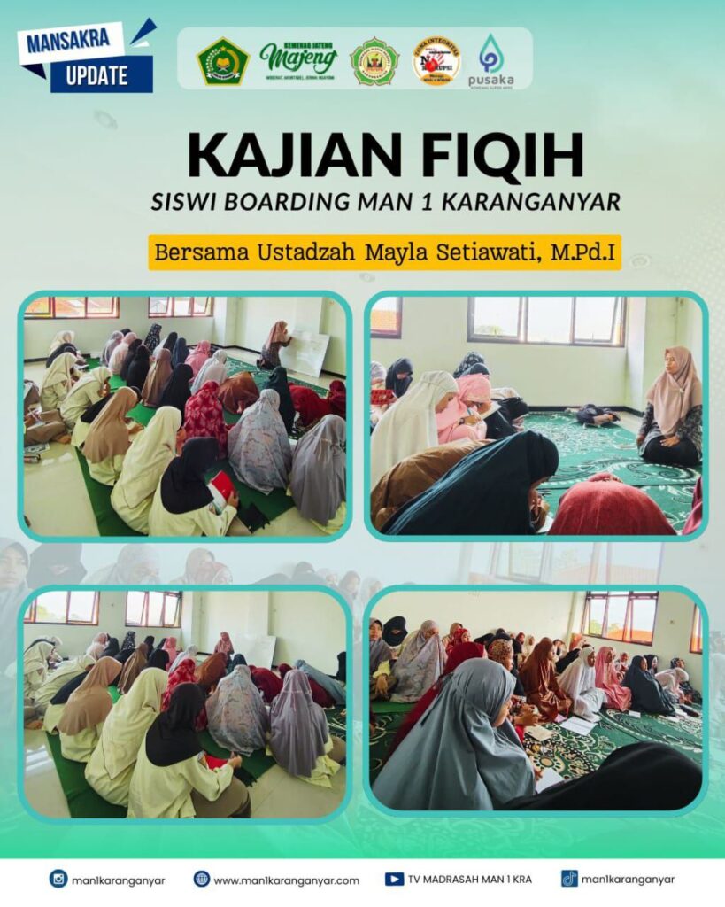 Penyelenggaraan kajian fiqih secara berkala ini menunjukkan komitmen MAN 1 Karanganyar dalam menciptakan lingkungan pendidikan yang mengintegrasikan nilai-nilai keislaman dengan kehidupan akademik. Program ini dirancang untuk memperkuat pemahaman agama sekaligus membentuk karakter religius siswa boarding school di MAN 1 Karanganyar. (Humas)