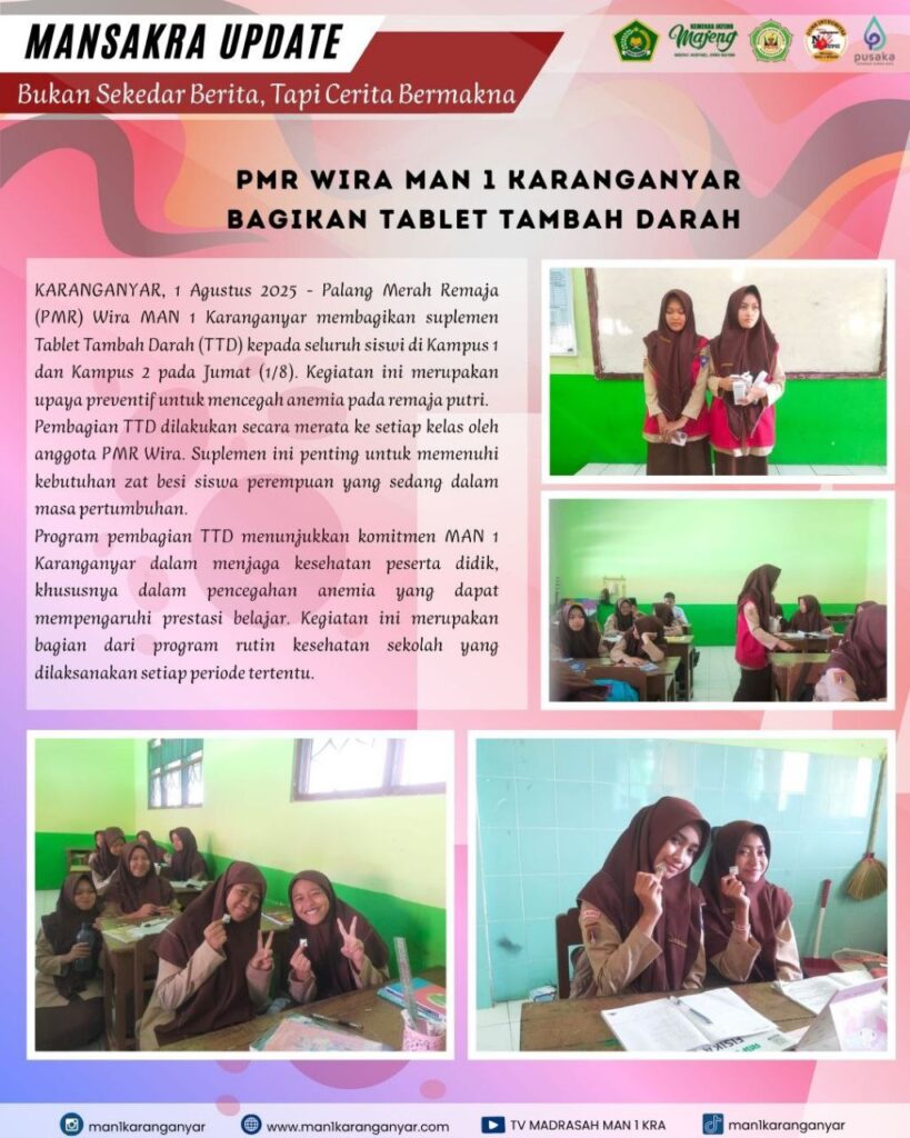KARANGANYAR, 1 Agustus 2025 – Palang Merah Remaja (PMR) Wira MAN 1 Karanganyar membagikan suplemen Tablet Tambah Darah (TTD) kepada seluruh siswi di Kampus 1 dan Kampus 2 pada Jumat (1/8). Kegiatan ini merupakan upaya preventif untuk mencegah anemia pada remaja putri. Pembagian TTD dilakukan secara merata ke setiap kelas oleh anggota PMR Wira. Suplemen ini penting untuk memenuhi kebutuhan zat besi siswa perempuan yang sedang dalam masa pertumbuhan.