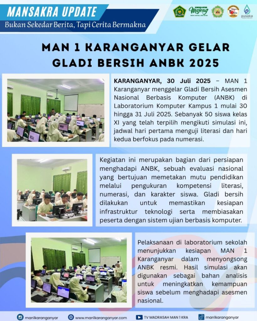 MAN 1 Karanganyar menyelenggarakan Gladi Bersih Asesmen Nasional Berbasis Komputer (ANBK) di Laboratorium Komputer Kampus 1 pada 30-31 Juli 2025. Sebanyak 50 siswa kelas XI terpilih mengikuti simulasi ini, dengan hari pertama menguji kompetensi literasi dan hari kedua berfokus pada numerasi, sebagai bagian dari persiapan menghadapi evaluasi nasional yang mengukur mutu pendidikan tersebut.