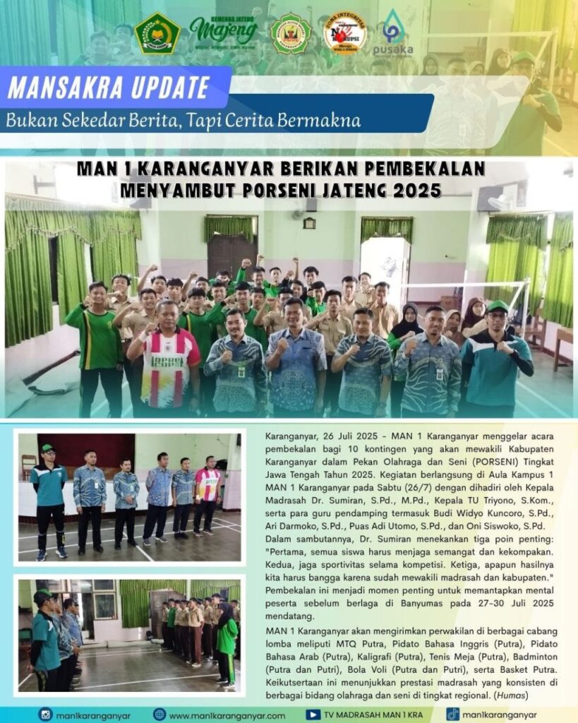 MAN 1 Karanganyar menyelenggarakan acara pembekalan bagi 10 kontingen yang akan mewakili Kabupaten Karanganyar dalam Pekan Olahraga dan Seni (PORSENI) Tingkat Provinsi Jawa Tengah tahun 2025. Kegiatan berlangsung di Aula Kampus 1 pada Sabtu, 26 Juli 2025 dengan dihadiri Kepala Madrasah Dr. Sumiran, S.Pd., M.Pd., Kepala Tata Usaha Triyono, S.Kom., serta para guru pendamping termasuk Budi Widyo Kuncoro, S.Pd., Ari Darmoko, S.Pd., Puas Adi Utomo, S.Pd., dan Oni Siswoko, S.Pd.