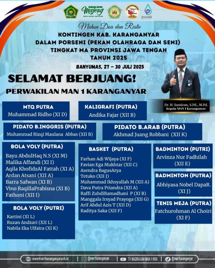 Kontingen MAN 1 Karanganyar akan berkompetisi dalam berbagai cabang lomba meliputi MTQ Putra (Muhammad Ridho XI D), Pidato Bahasa Inggris Putra (Muhammad Rizqi Maulana Abbas XII B), Pidato Bahasa Arab Putra (Akhmad Juang Robbani XII K), Kaligrafi Putra (Andika Fajar XII B), Tenis Meja Putra (Fatchurohman Al Choiri XI F), Badminton Putra dan Putri (Abhiyasa Nobel Dapa R. XI J dan Arvinza Nur Fadhilah XII E), Bola Voli Putra (Bayu Abdul Haq N.S. XI M, Malika Affandi XI I, Aqila Khofidz Al Fattah XI A, Ardan Atsani XII A, Barra Safwan XI B, Vino Raqilla Prabisna XI B, Fathoni XII I), Bola Voli Putri (Kartini XI L, Ruzan Andzari XII L, Nabila Eka Ulfaira XI K), serta Basket Putra (Farhan Adi Wijaya XI F, Favian Ega Mukhtar XII C, Asendra Bagus Arya Tetuko XII J, Muhammad Ikhsyallah M XII A, Dava Putra Priandra XII A, Raffi Zuhdi Ramadhani P XI B, Manggala Irsyad Prayoga XII G, Arif Abdul Azis T XII D, Raditya Saka XII F). Keikutsertaan ini menunjukkan prestasi madrasah di berbagai bidang olahraga dan seni.