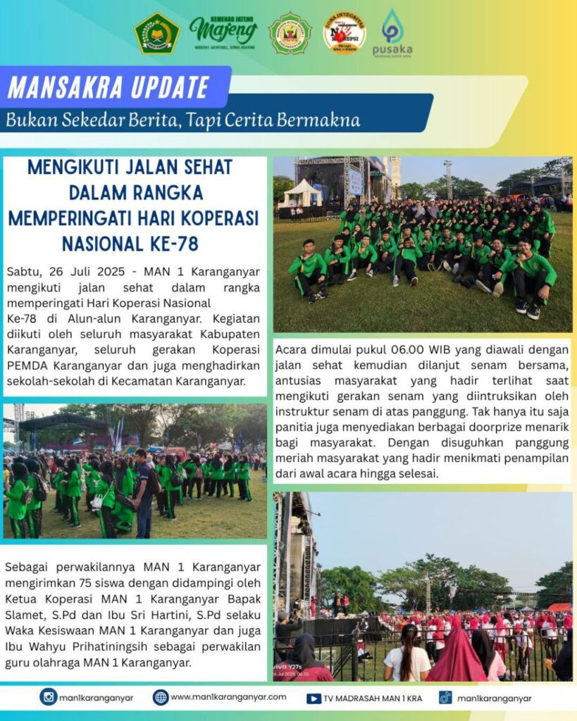 MAN 1 Karanganyar berpartisipasi dalam jalan sehat memperingati Hari Koperasi Nasional ke-78 di Alun-alun Karanganyar pada Sabtu, 26 Juli 2025. Sebanyak 75 siswa mengikuti kegiatan yang dihadiri seluruh masyarakat Kabupaten Karanganyar, gerakan koperasi PEMDA, dan sekolah-sekolah se-Kecamatan Karanganyar ini dengan didampingi Ketua Koperasi MAN 1 Karanganyar Slamet, S.Pd., Wakil Kepala Madrasah Bidang Kesiswaan Sri Hartini, S.Pd., serta guru olahraga Wahyu Prihatiningsih, S.Pd.