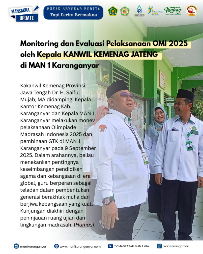 Dr. H. Saiful Mujab, MA., Kepala Kantor Wilayah Kementerian Agama Provinsi Jawa Tengah, melakukan kunjungan kerja ke MAN 1 Karanganyar pada Selasa, 9 September 2025. Kunjungan ini bertujuan untuk meninjau pelaksanaan Olimpiade Madrasah Indonesia 2025 Tingkat MA/SMA di seluruh Kabupaten Karanganyar sekaligus mengawal perkembangan madrasah di wilayah Karanganyar dan sekitarnya.