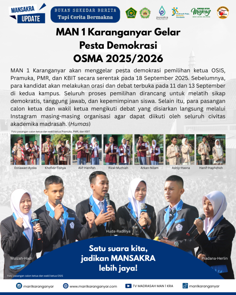 MAN 1 Karanganyar akan menggelar pesta demokrasi pemilihan ketua dan wakil ketua Organisasi Siswa Madrasah (OSMA) untuk periode 2025/2026 secara serentak pada Kamis, 18 September 2025. Pemilihan ini mencakup OSIS, Pradana dan Pradani Ambalan Pramuka, PMR, serta Kelompok Bina Iman dan Taqwa (KBIT) sebagai bentuk pendidikan demokrasi dan kepemimpinan bagi siswa.