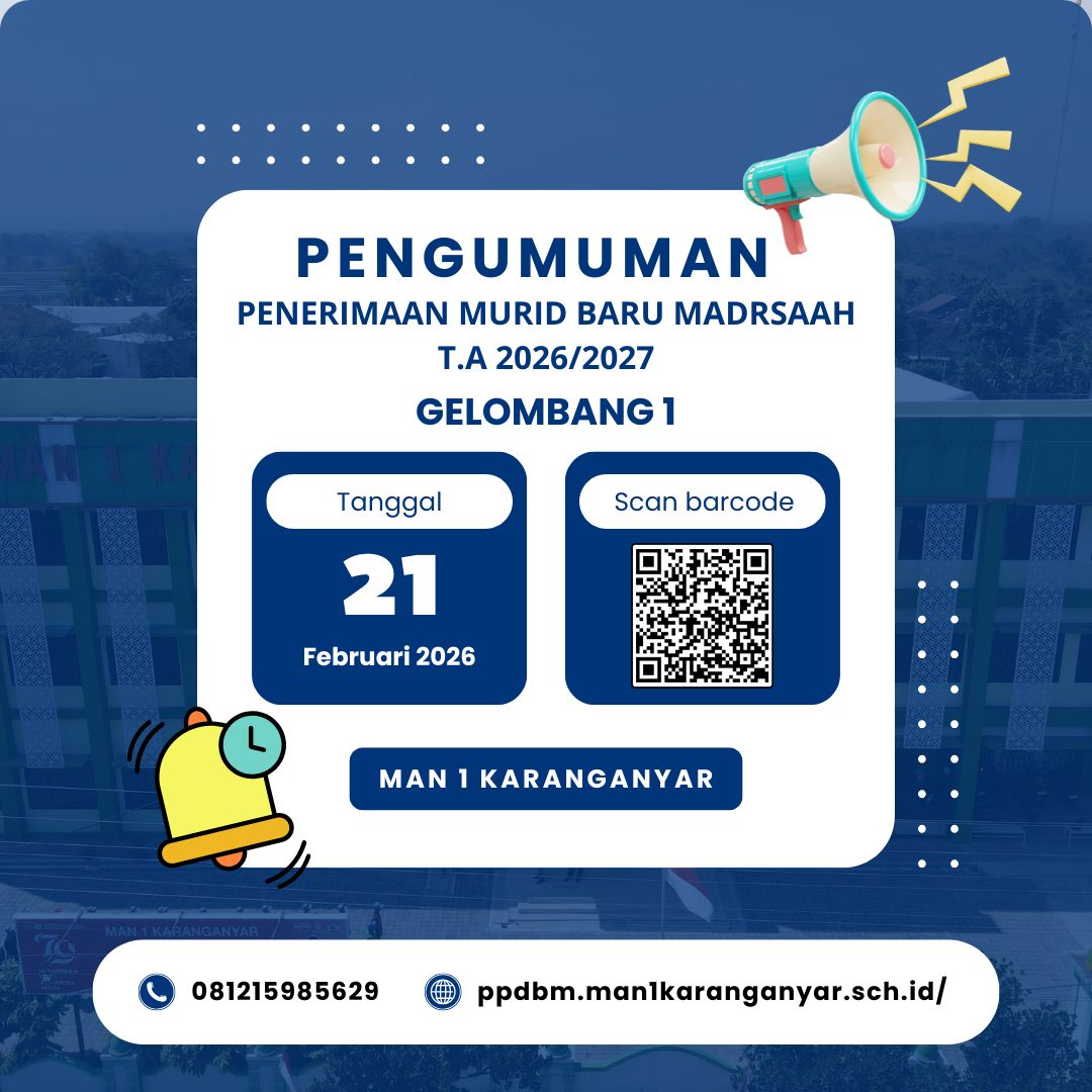 Keluarga besar MAN 1 Karanganyar mengucapkan Selamat dan Barakah kepada seluruh calon siswa yang telah dinyatakan diterima. Keberhasilan ini merupakan langkah awal bagi kalian untuk bertumbuh di lingkungan madrasah yang mengedepankan prestasi dan akhlakul karimah. Bagi peserta yang dinyatakan lolos, diwajibkan untuk segera melakukan proses Daftar Ulang dan verifikasi berkas administrasi sesuai dengan jadwal dan persyaratan yang telah ditentukan.